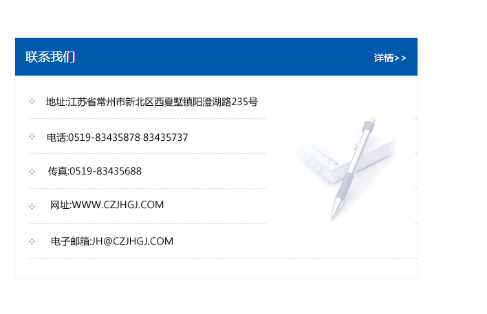 傳真:0519-83435688    郵編:213135    網(wǎng)址:WWW.czjhgj_com.chongguanvip.com    電子郵箱:JH@czjhgj_com.chongguanvip.com